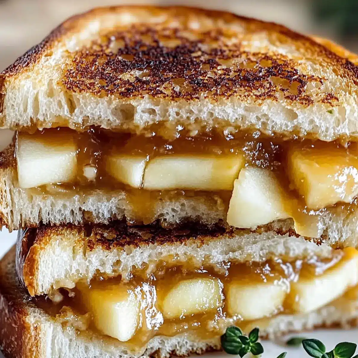 - Layer on the creamy Brie cheese, thin slices of apple, and a sprinkle of fresh thyme before topping with the remaining slice of bread.