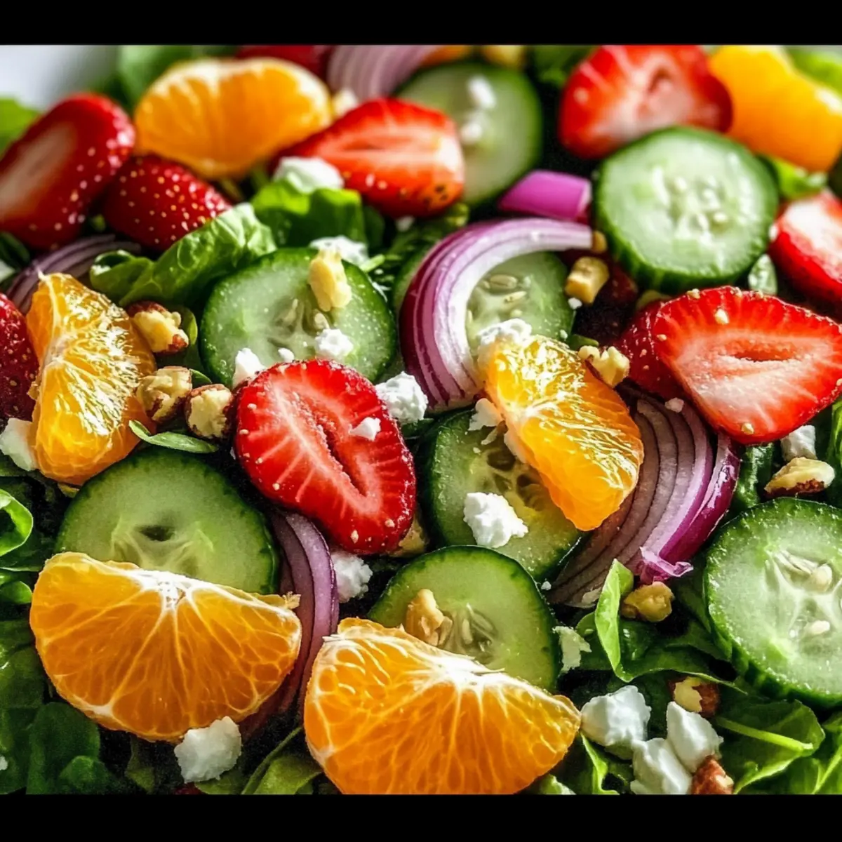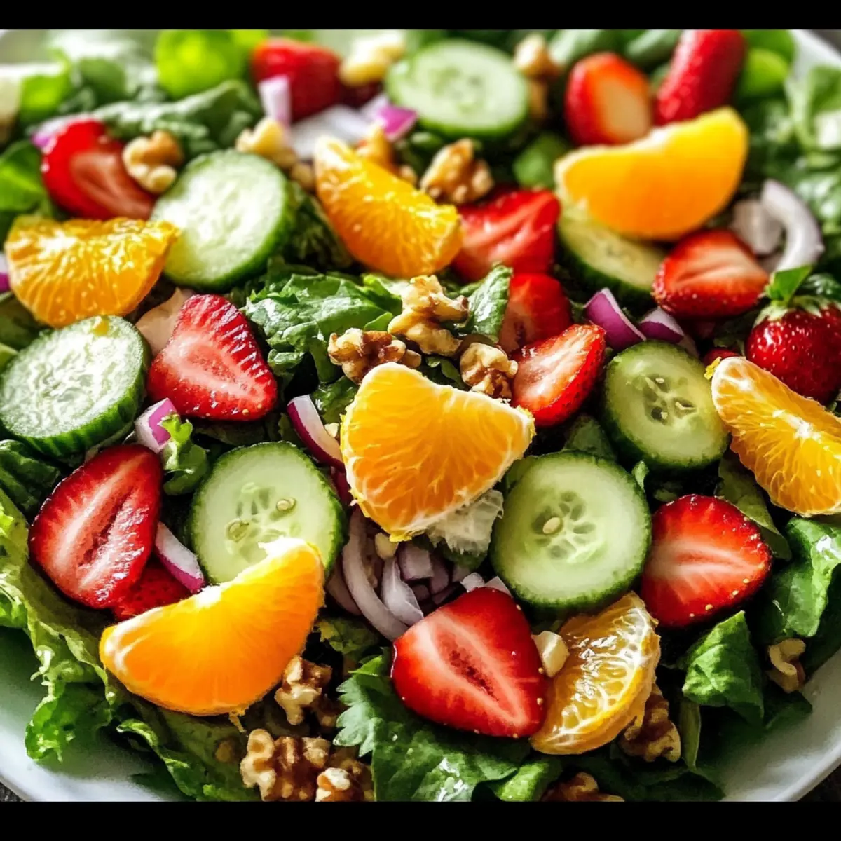 - In a large bowl, combine mixed salad greens, fresh strawberries, segmented oranges, and chopped cucumber. Add thinly sliced red onion.