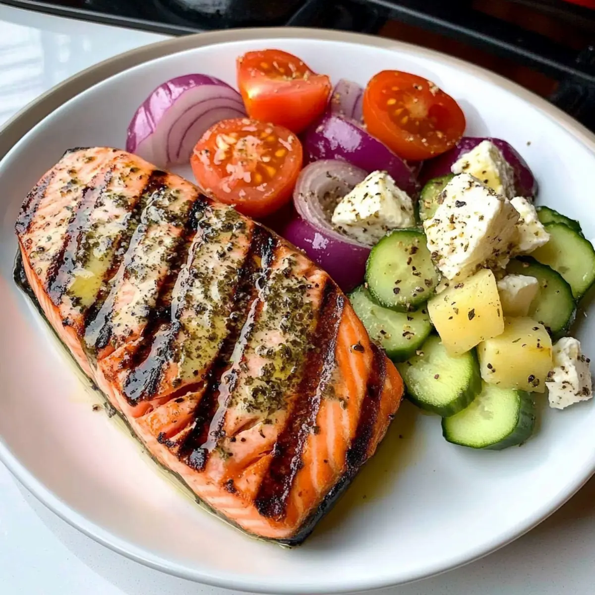 Grilled Salmon Steaks with Feta Salad and Herb-Butter Potatoes