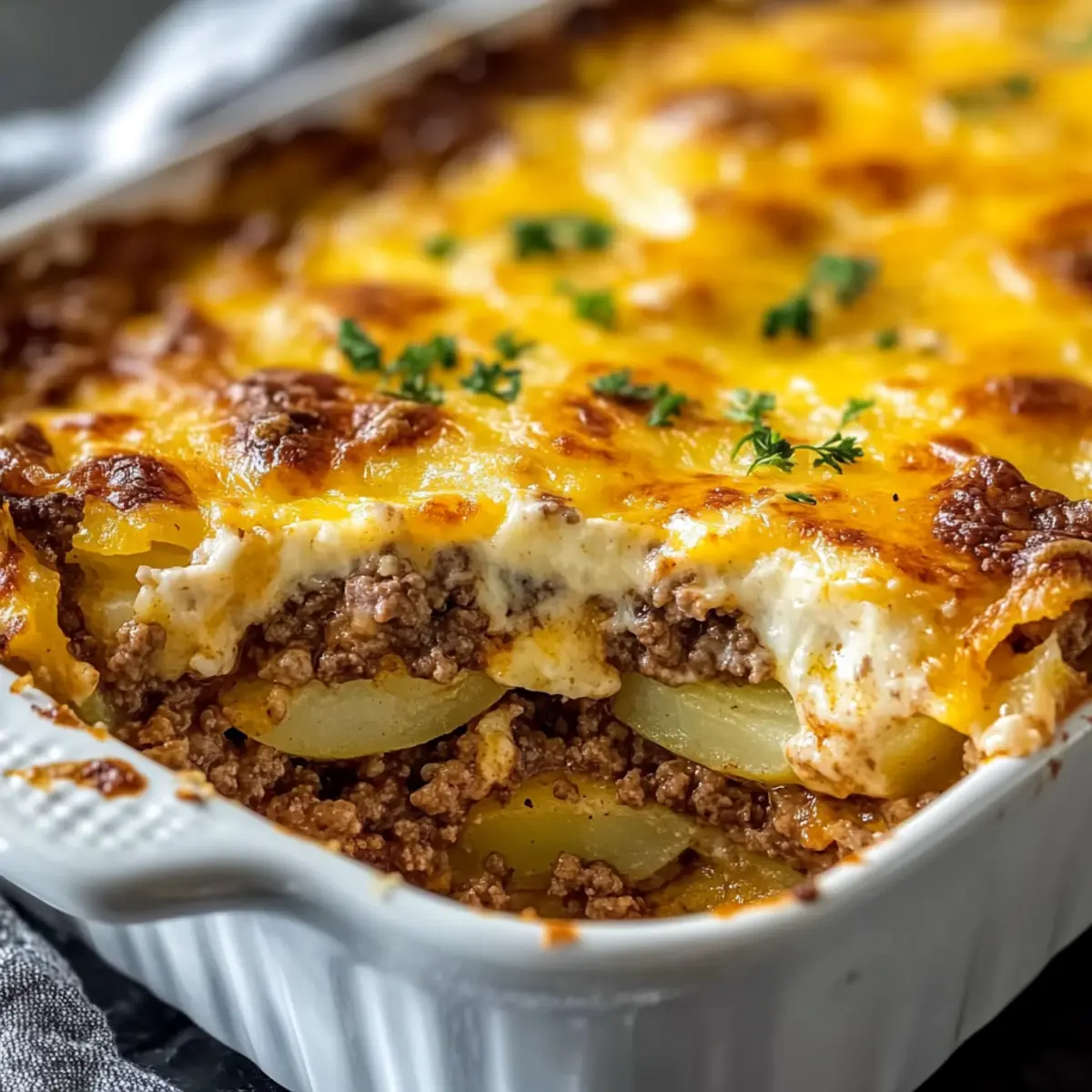 - Layer half of the sliced potatoes in the greased baking dish, followed by half of the beef mixture. Drizzle with a portion of the creamy sauce, and sprinkle with cheddar cheese. Repeat layers, finishing with potatoes and cheese on top.