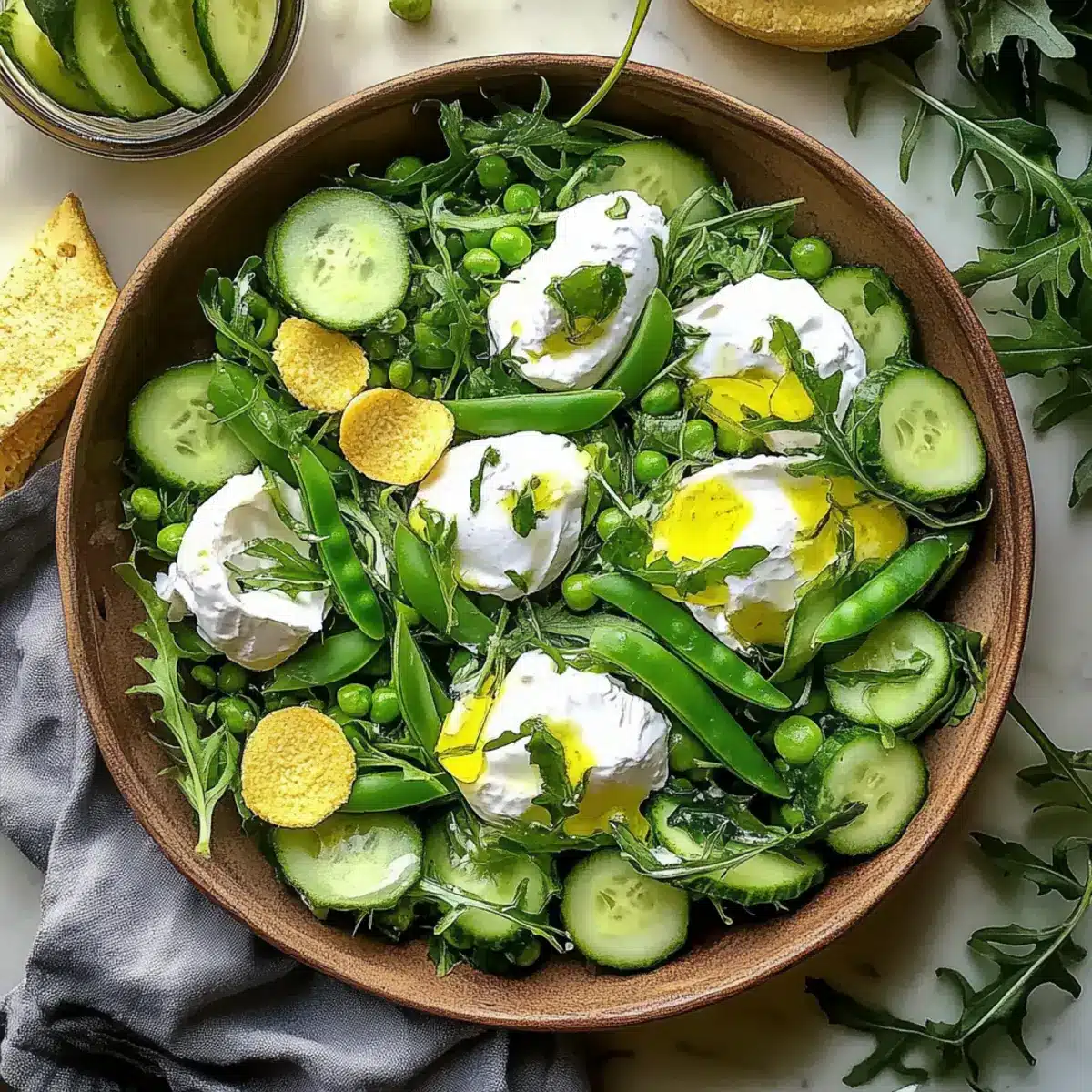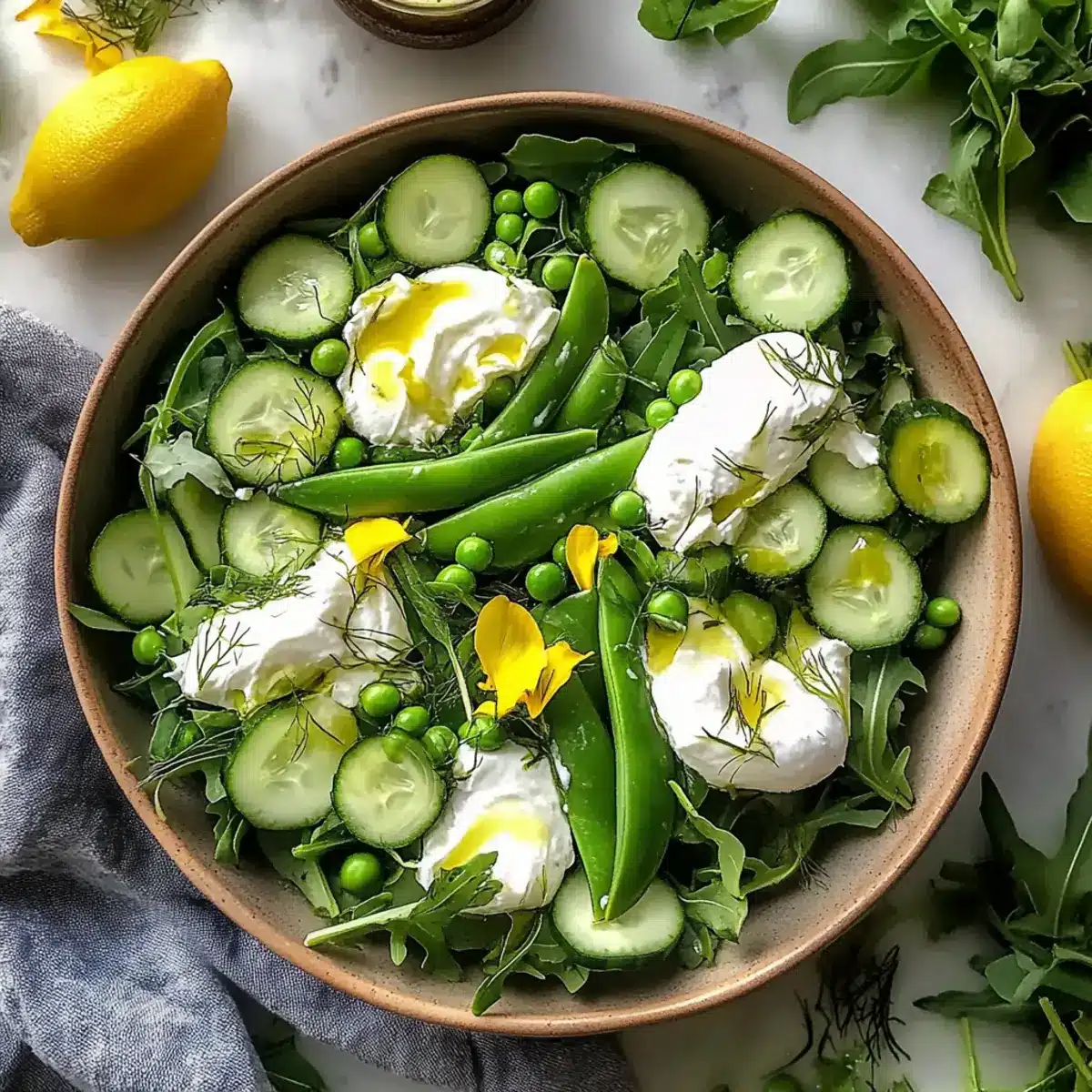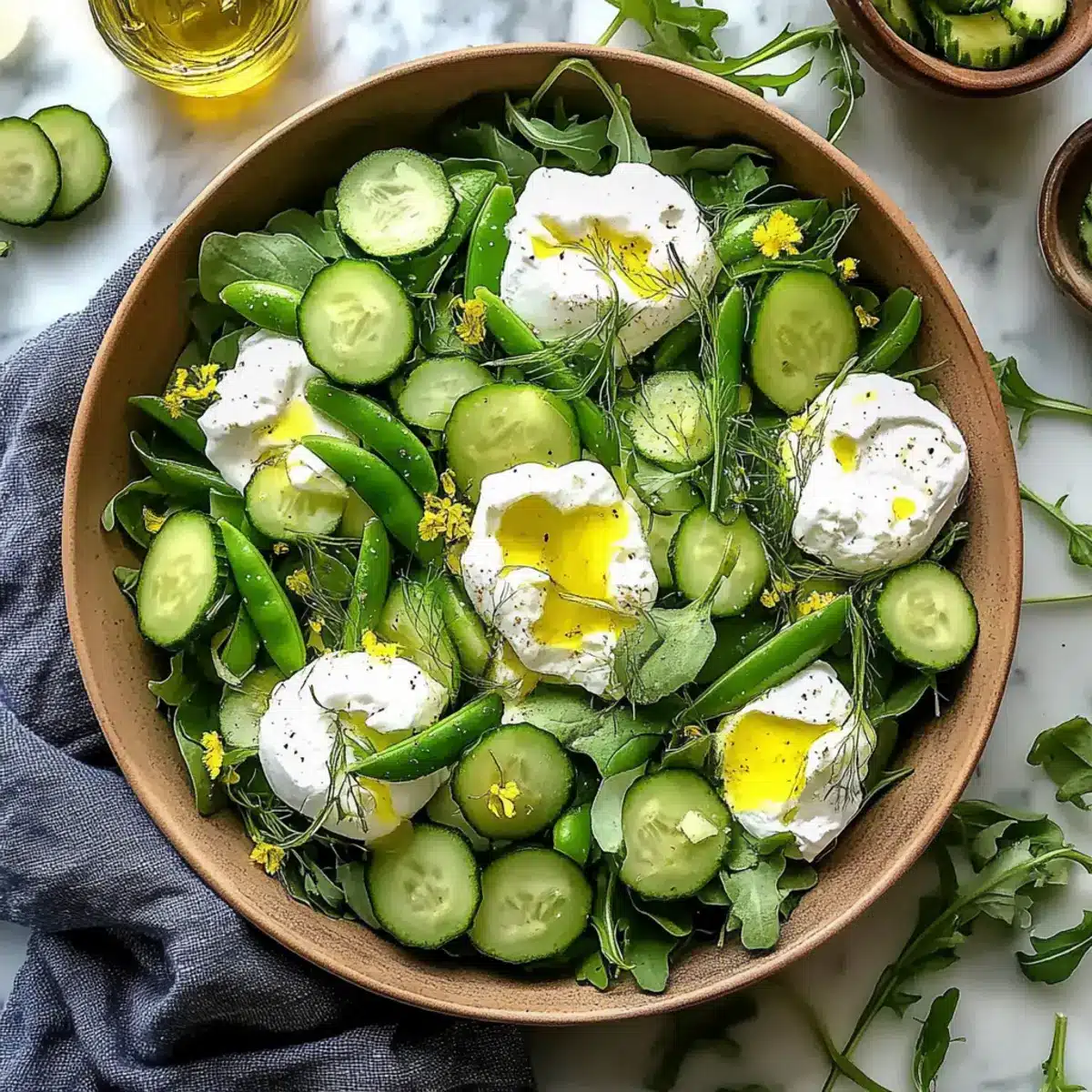 On a large serving platter or in a mixing bowl, create a bed of peppery arugula as the base of your salad. Layer the blanched sugar snap peas, edamame, sliced cucumbers, and aromatic leeks on top. Finally, gently tear the fresh burrata into pieces and place them atop the colorful medley, ensuring every bite contains a bit of that creamy goodness.