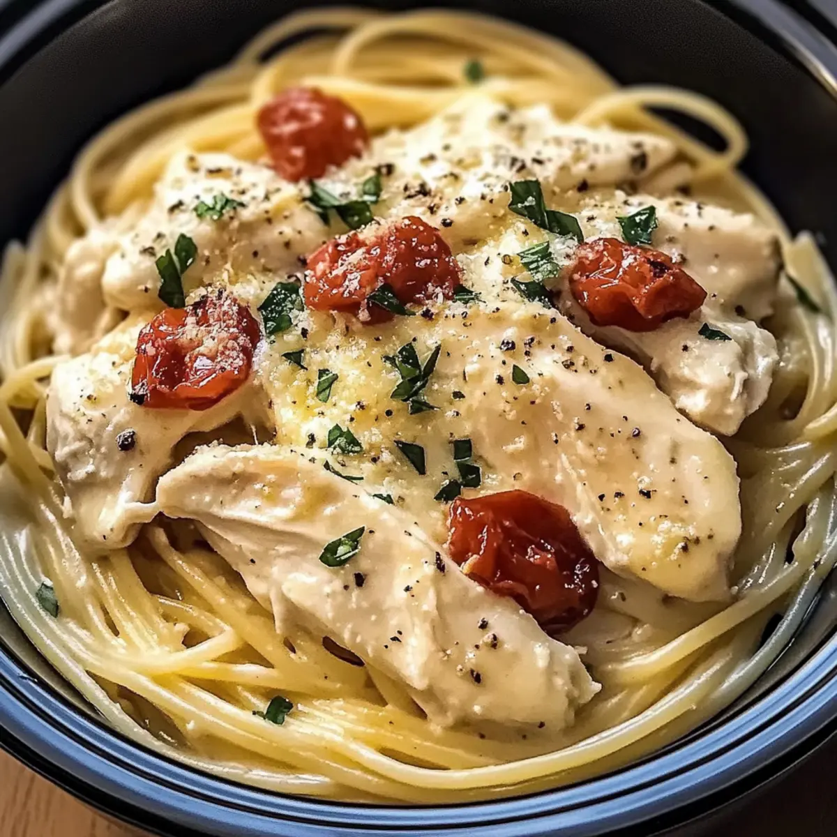 - Serve cooked pasta with the creamy shredded chicken mixture on top, garnished with parsley and Parmesan.