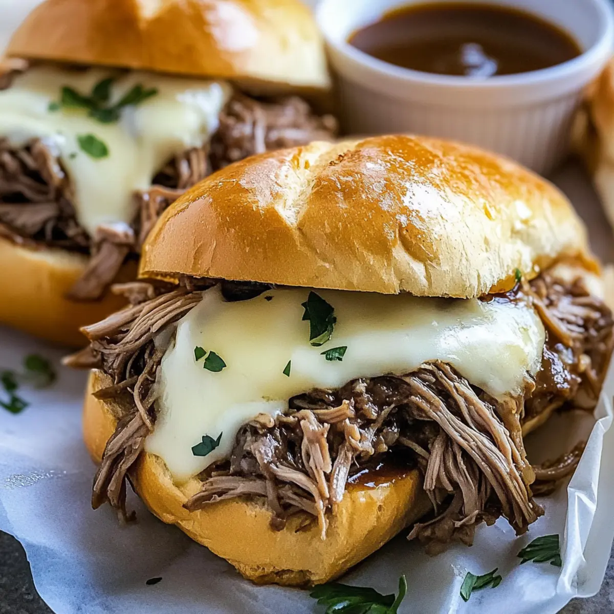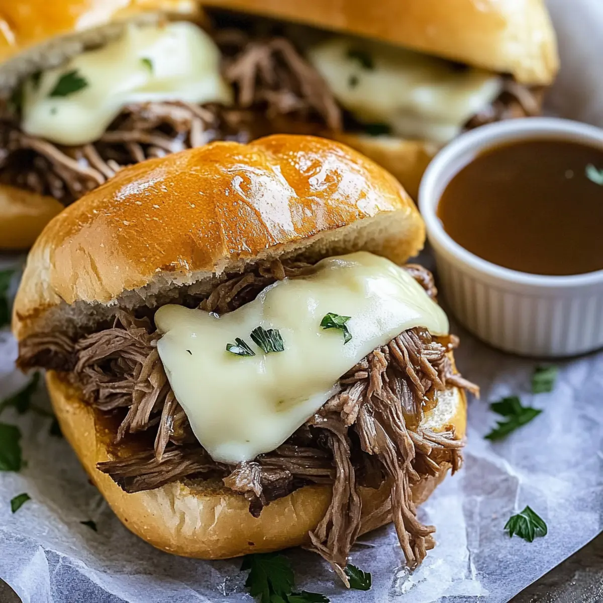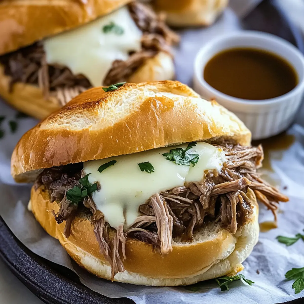 - Assemble the sandwiches by filling each roll with shredded beef and serve with au jus for dipping.