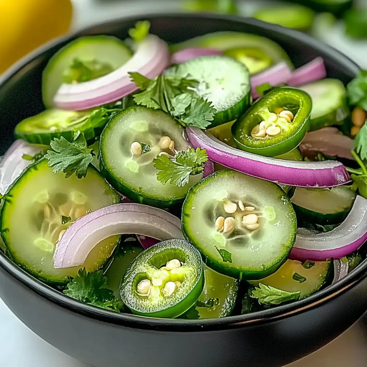 Absolutely! This Cucumber Jalapeno Salad is gluten-free and low in calories, making it a healthy choice for most diets. However, if you’re serving it to guests, be mindful of jalapeño sensitivity. Some folks may find it spicy; consider providing a milder alternative by removing the seeds and pith from the jalapeño or reducing the quantity used.