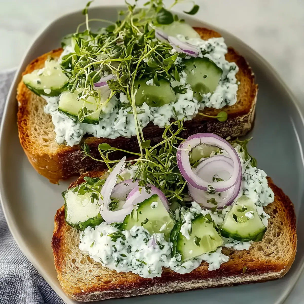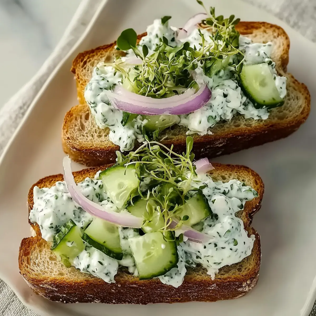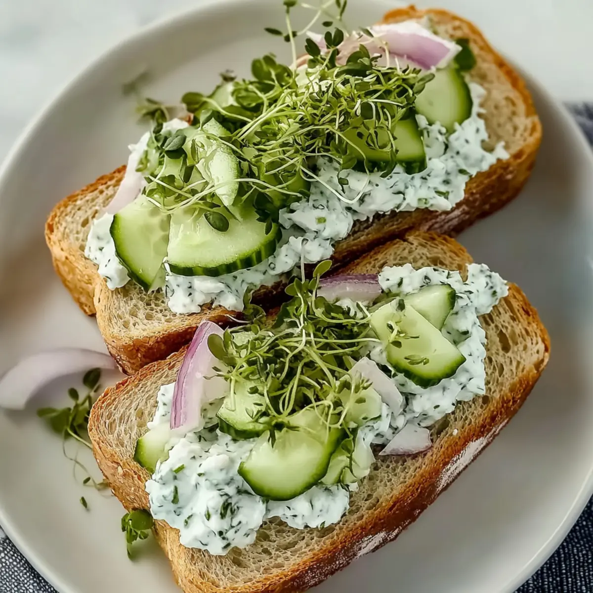 - Lay out your toasted bread slices, add a generous layer of the cucumber mixture on one slice, then top with sprouts and onions if desired.