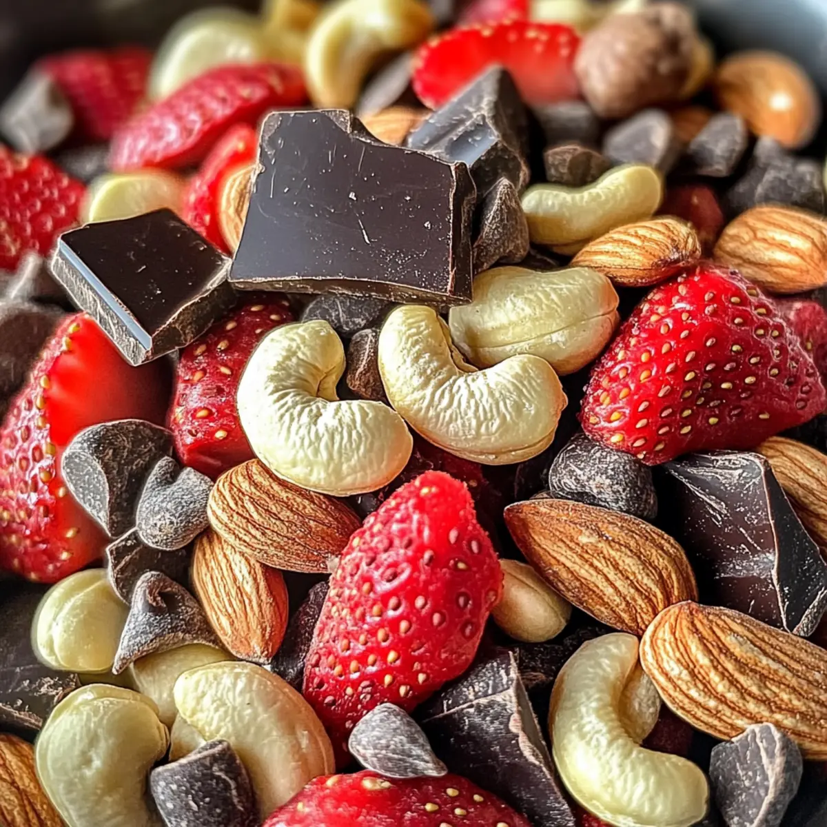 - Freeze-dried Strawberries – Offers natural sweetness and vibrant color in this Dark Chocolate Trail Mix; can be replaced with dried cranberries for a tart twist.