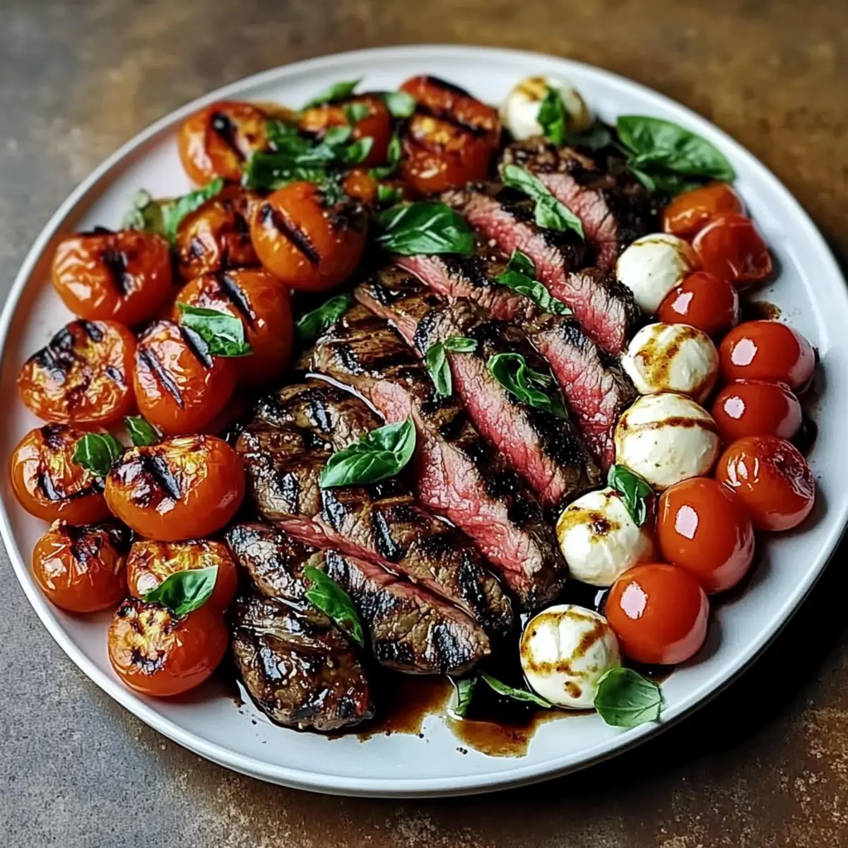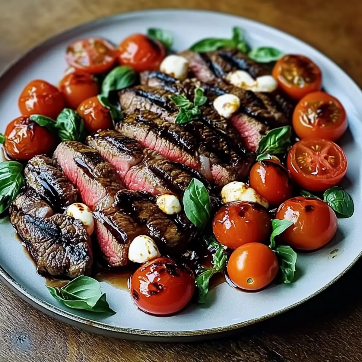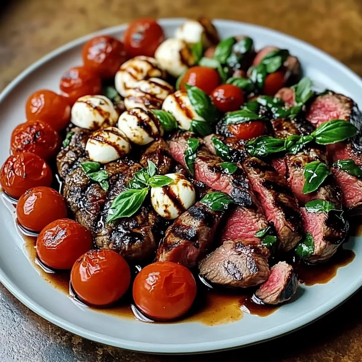 - Serve by arranging the sliced steak on a platter with the Caprese salad and drizzle with balsamic glaze.