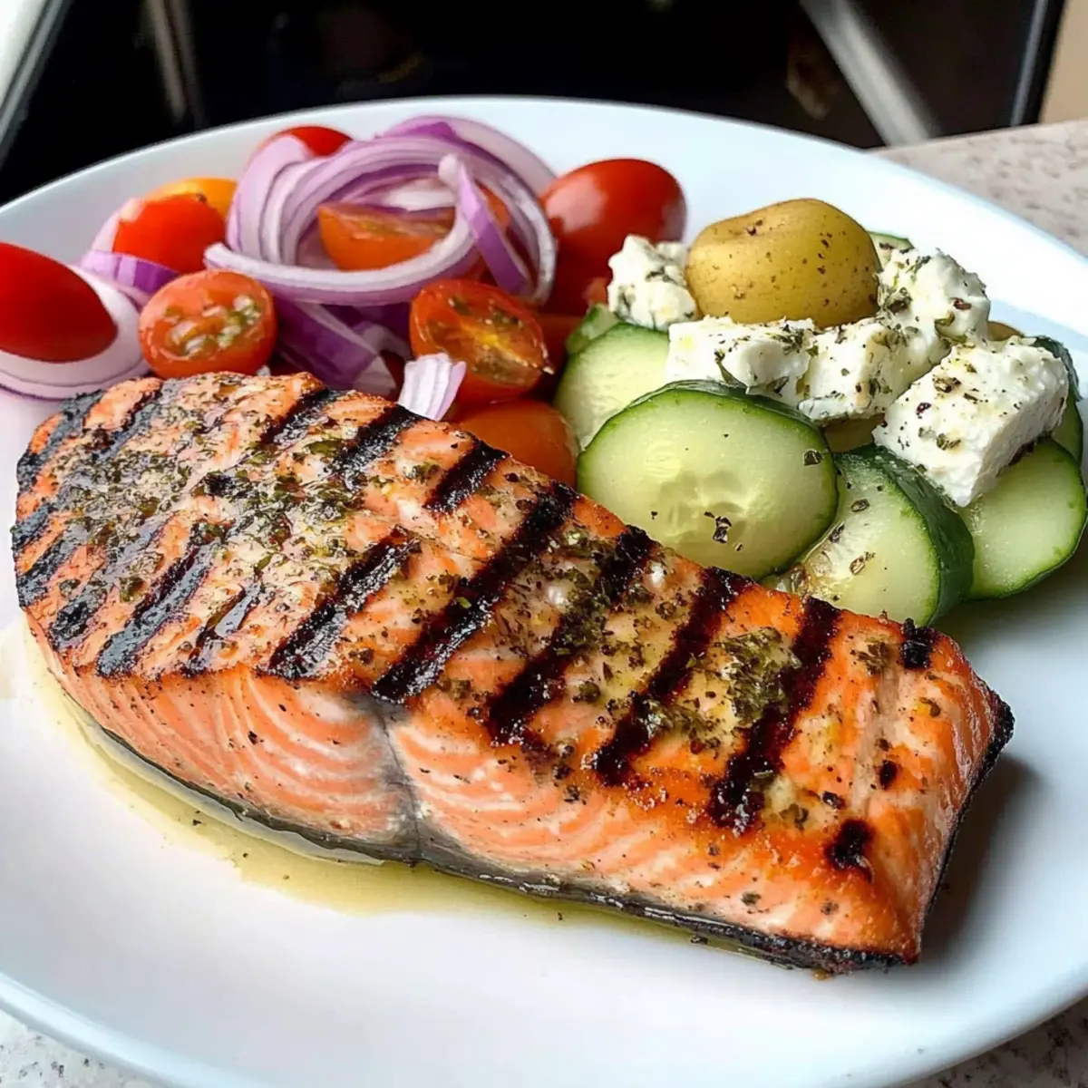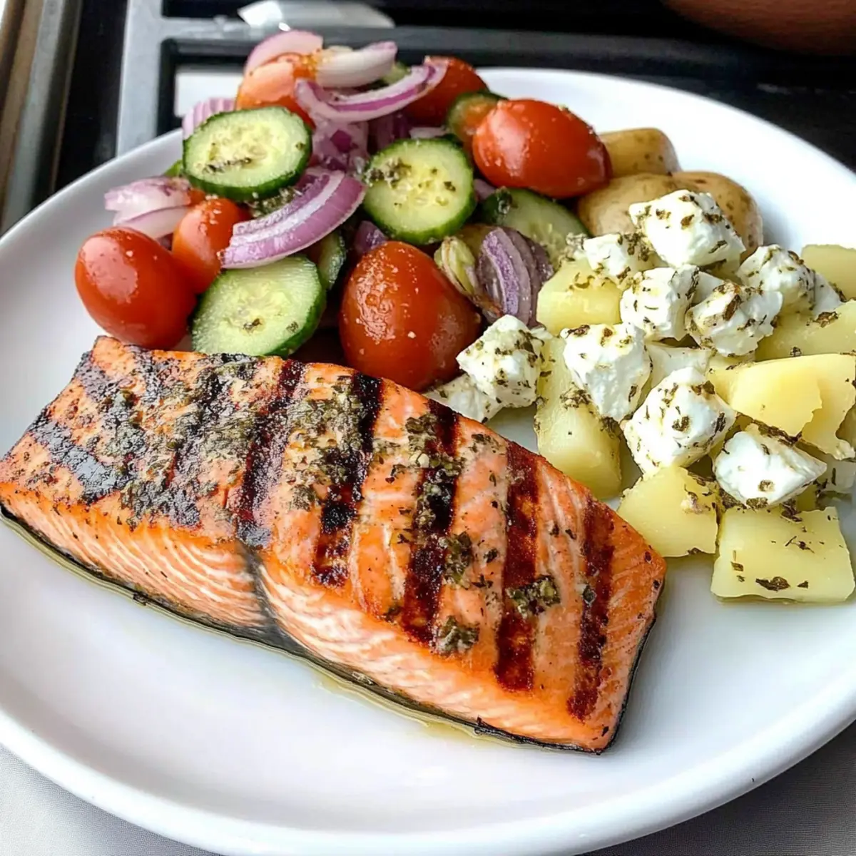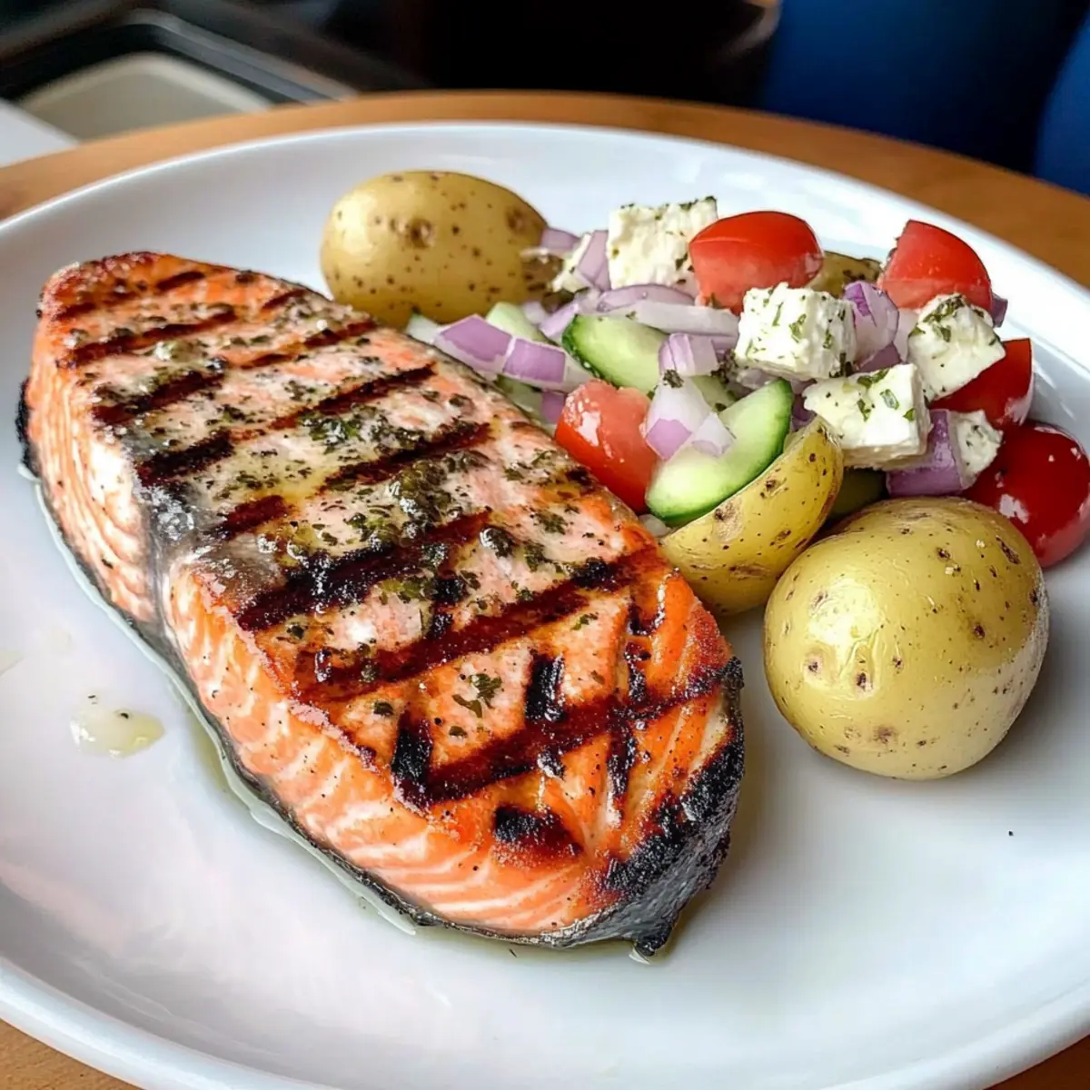 Grilled Salmon Steaks with Feta Salad and Herb-Butter Potatoes