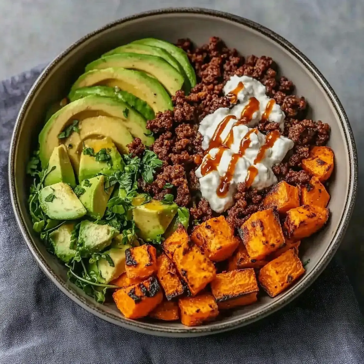 - Assemble the bowl with roasted sweet potatoes on the bottom, topped with seasoned ground beef, slices of avocado, and scoops of cottage cheese.