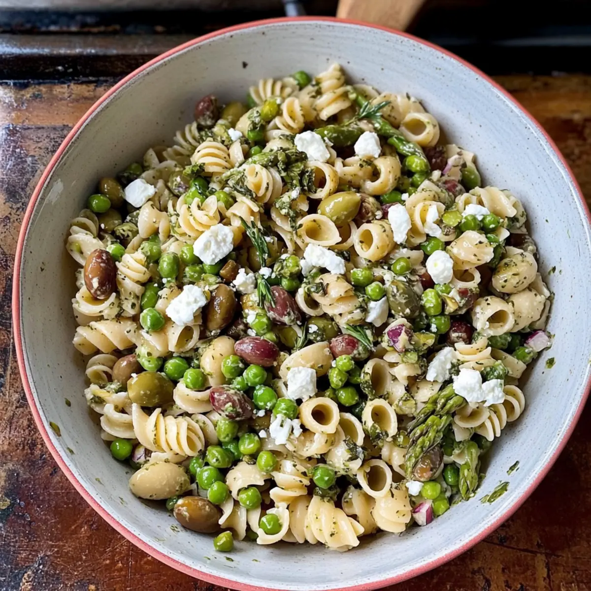 - In a large bowl, combine the cooled pasta, blanched asparagus, peas, marinated red onions, chopped pistachios, and chopped celery. Fold in California Ripe Olives and fresh herbs.