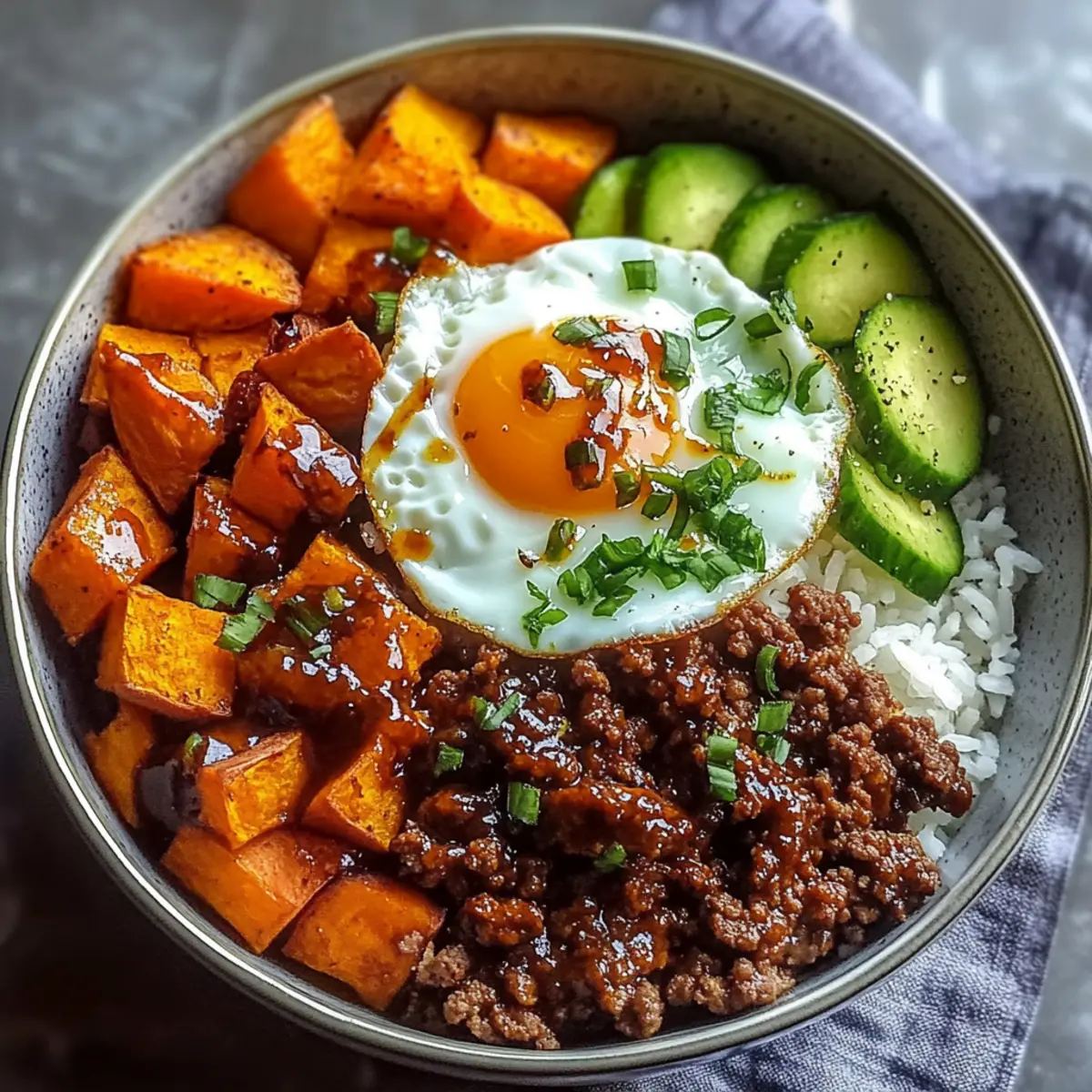 - Assemble bowls with rice, hot honey beef, sweet potatoes, avocado, and fried egg.