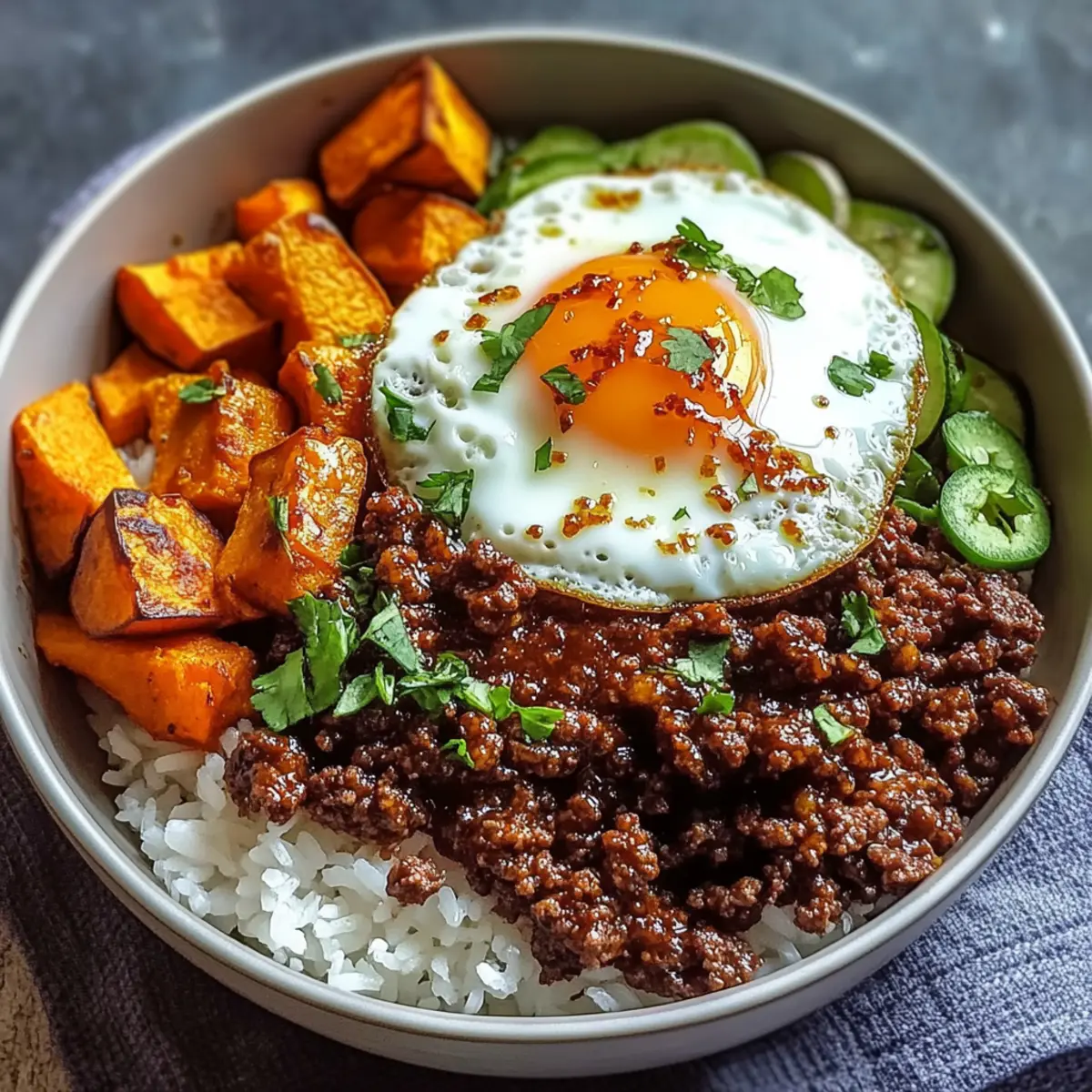 Begin assembling your bowls by placing a generous serving of rice at the bottom. Top it with the savory hot honey ground beef mixture and the perfectly roasted sweet potatoes. Then add sliced avocado and finally, the fried egg on top, creating a symphony of flavors and textures that will be a feast for the eyes as well.