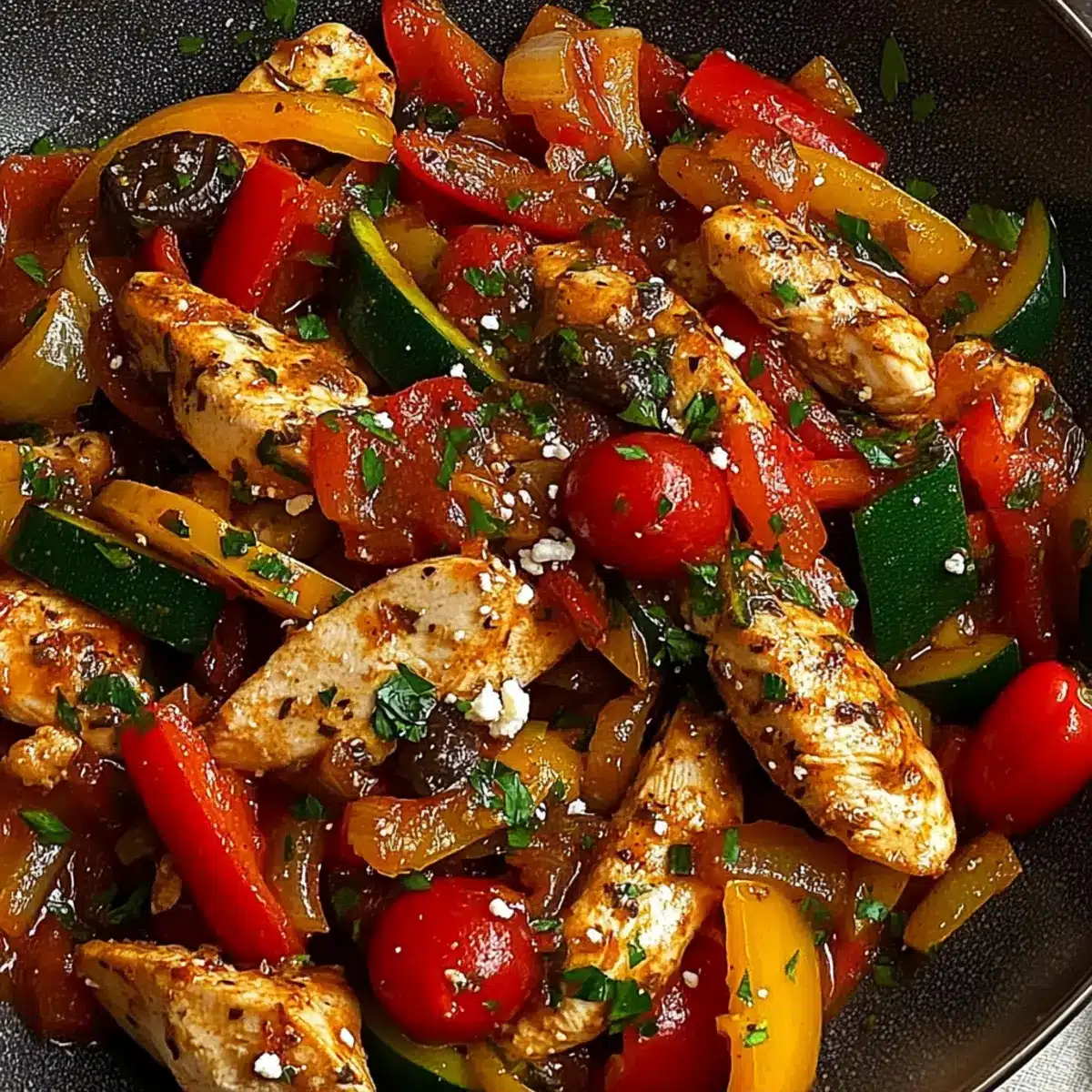 These Mediterranean Chicken Stir Fry ingredients are perfect for meal prep enthusiasts! You can chop the chicken and vegetables (zucchini, bell peppers, and onion) up to 24 hours in advance, storing them in airtight containers in the refrigerator to maintain their freshness and prevent browning. Additionally, you can pre-sauté your chicken and store it separately for up to 3 days, keeping it tender and ready to combine with quickly sautéed vegetables when it’s time to serve. When you’re ready to enjoy this vibrant dish, simply reheat the chicken, sauté your prepped veggies with garlic, and mix everything in with the olives and feta for equally delicious results. Enjoy the ease of preparing a homemade meal with minimal stress on busy weeknights!