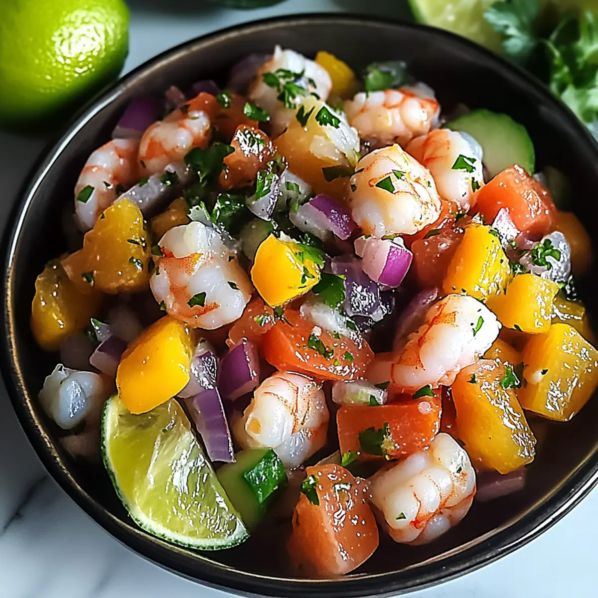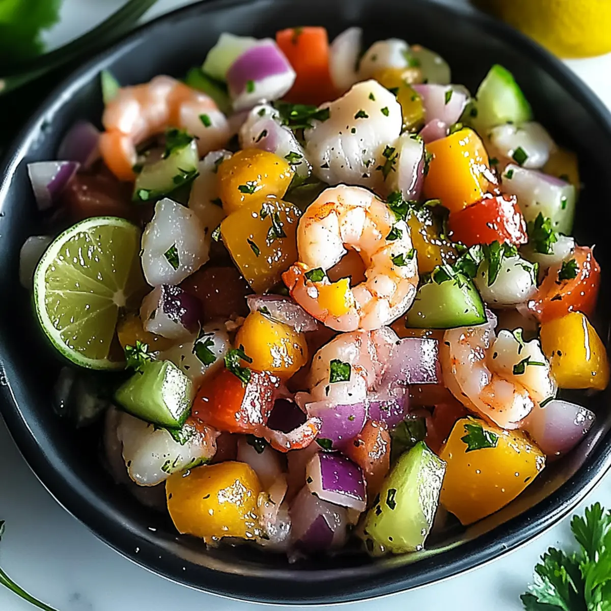 These Zesty Mexican Ceviche are perfect for meal prep enthusiasts! You can prep the seafood mix (fish and shrimp) and cover it with lime and lemon juice up to 24 hours in advance, allowing the flavors to meld beautifully in the refrigerator. Additionally, chop the vegetables (red onion, tomato, cucumber, and jalapeño) a day ahead and keep them stored in an airtight container to maintain freshness. When you’re ready to serve, simply combine the marinated seafood with the prepped vegetables, add orange juice, and season. Gently fold in the diced avocado just before serving to keep it creamy and vibrant. This way, you’ll have a fresh, restaurant-quality appetizer on the table with minimal effort!