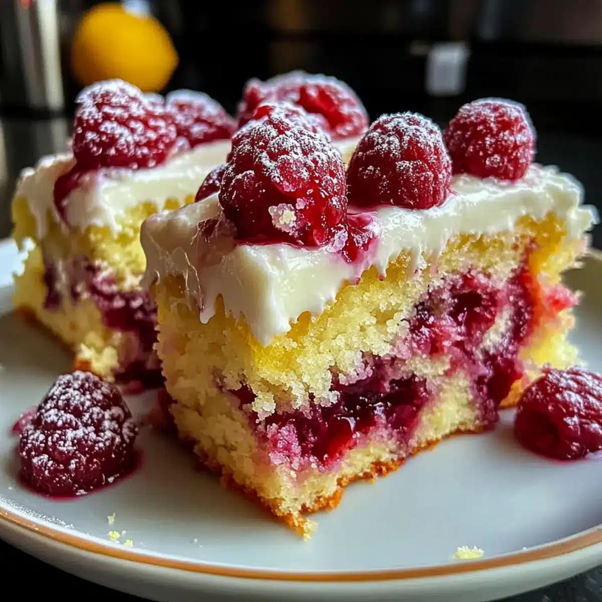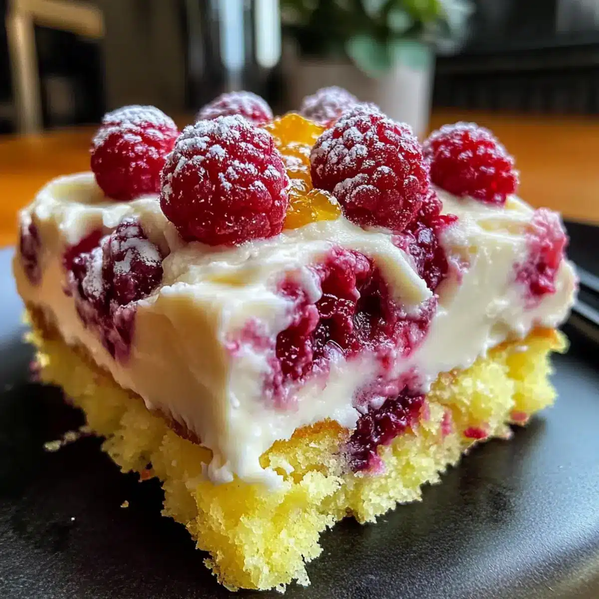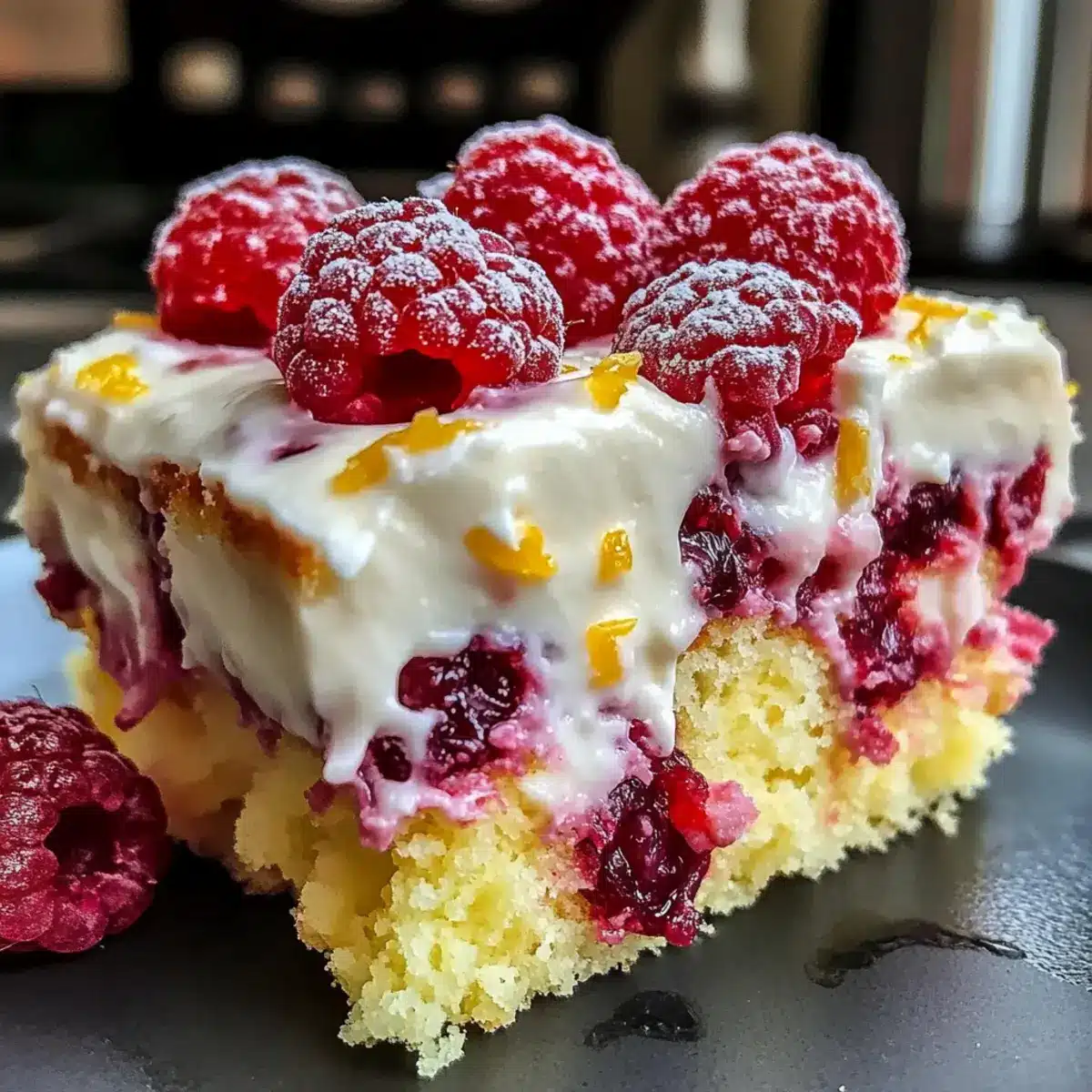 - Slice into squares and optionally garnish with fresh raspberries or lemon zest before serving.