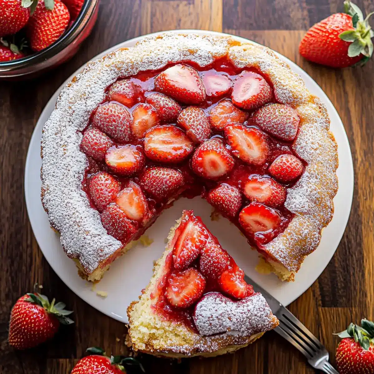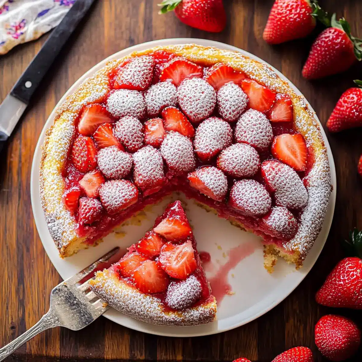 For a fun twist, involving kids in the decorating process can make it more enjoyable! Let them sprinkle the powdered sugar on top before serving or have them help pour the strawberry sauce over the cake. You can also reduce the sugar to suit their taste; the strawberries will still provide natural sweetness!