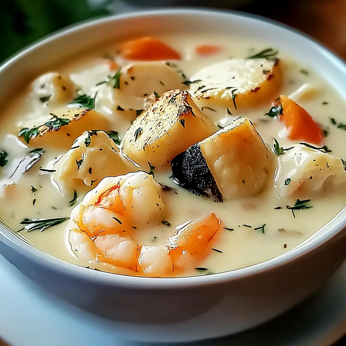 - Gently fold in your choice of seafood—cubed white fish, shrimp, and scallops—into the chowder. If using, add mussels or clams now as well.