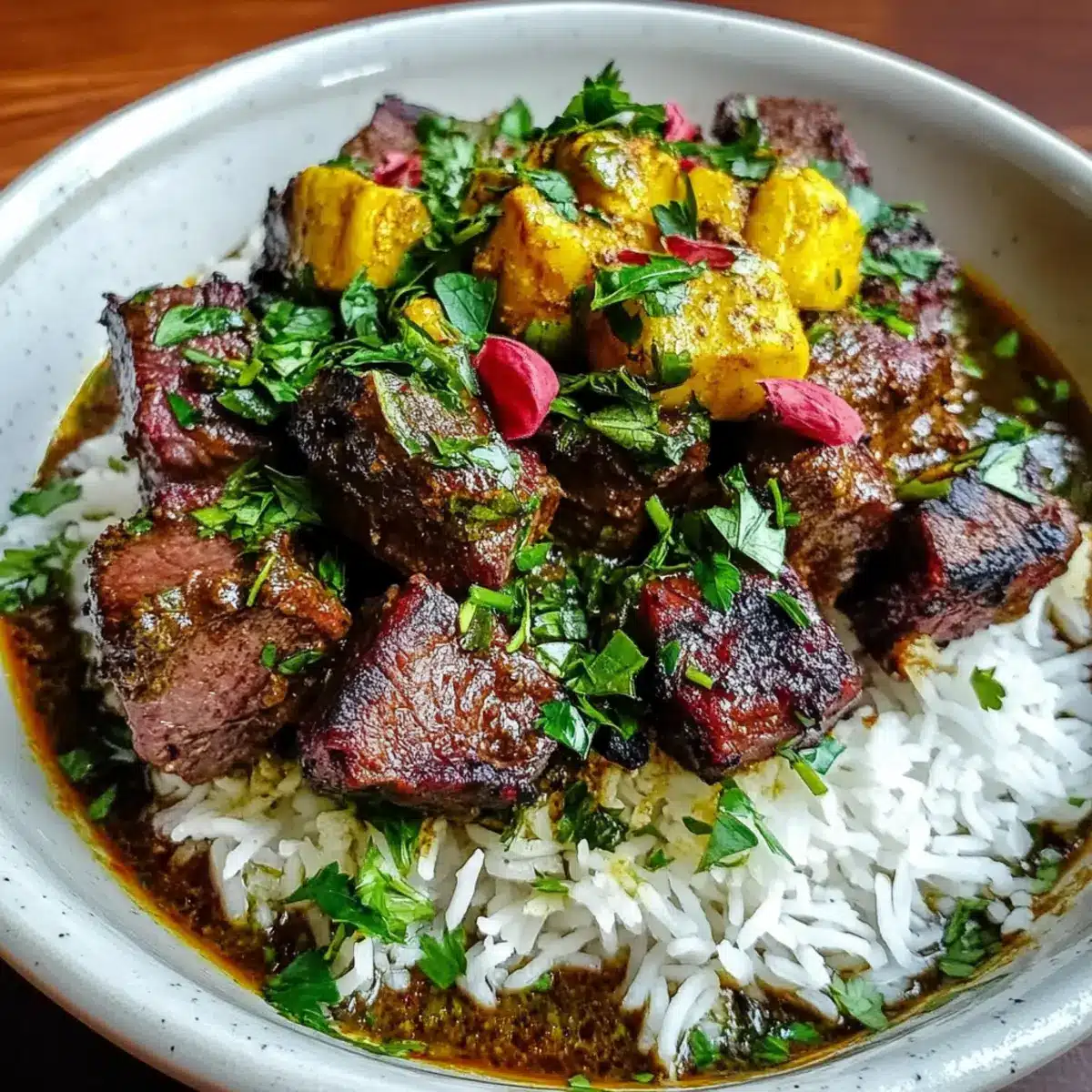 Once the meat is tender, remove the pot from heat and stir in chopped fresh parsley and mint. These vibrant herbs will brighten the dish, creating a beautiful contrast to the rich, deep flavors of the Persian Shish Andaz. Allow it to rest for a few minutes to let the flavors settle.