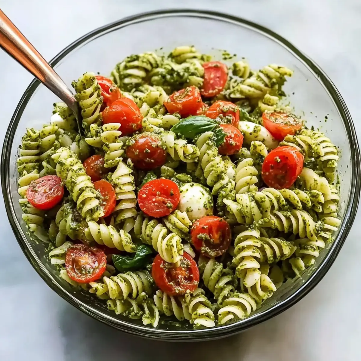 Flavorful Fusion: This Pesto Pasta Salad combines juicy cherry tomatoes and creamy mozzarella, creating a delightful harmony of tastes that bursts in your mouth.