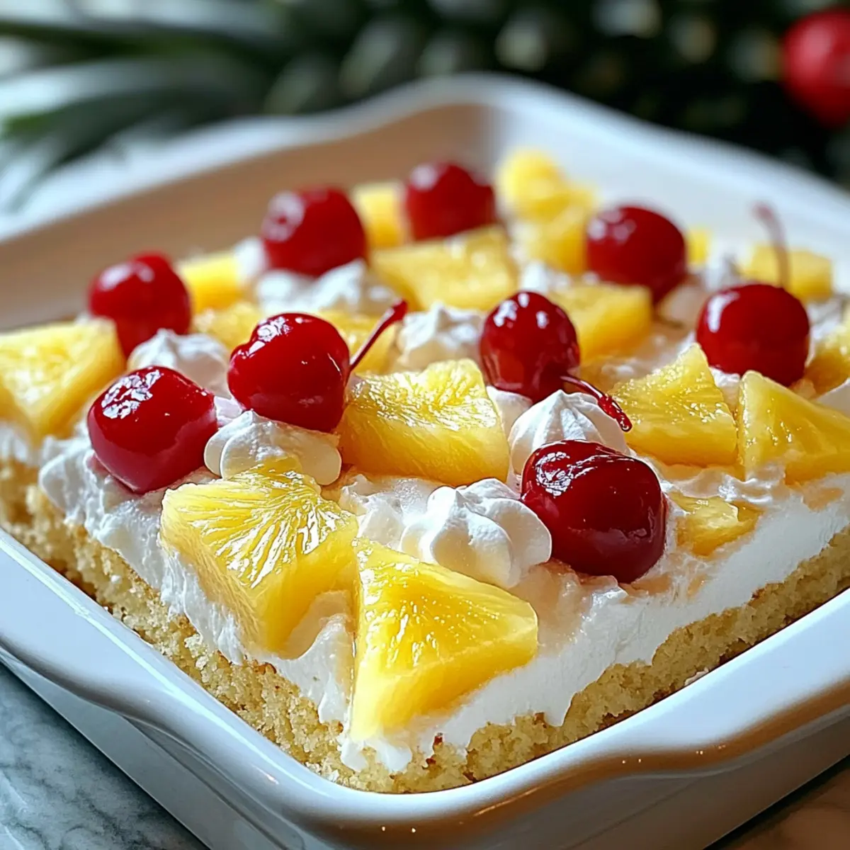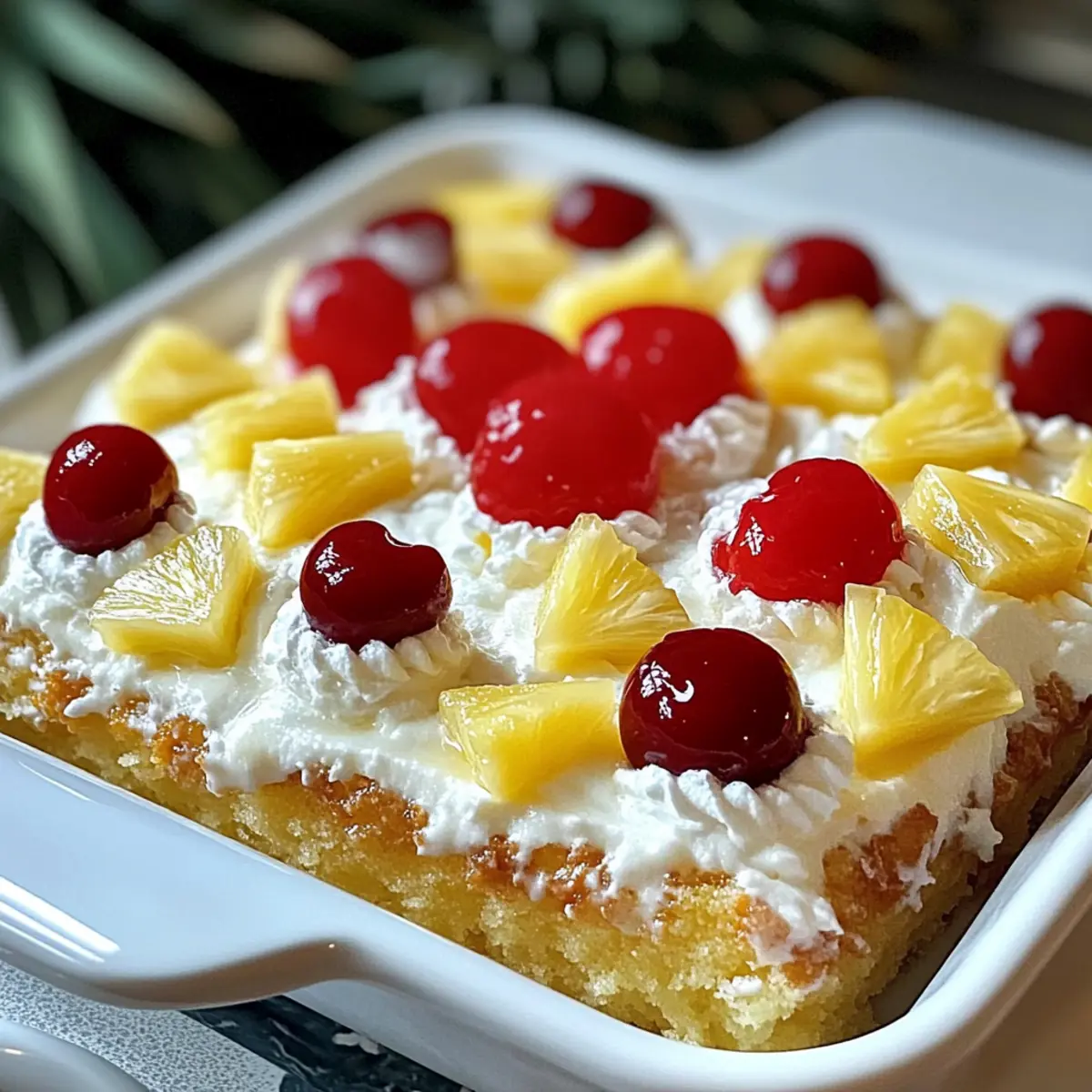 To finish, decorate your cake with drained pineapple chunks and maraschino cherries on top for a vibrant look. Scatter them artfully across the whipped topping to create a fun and inviting appearance. These bright toppings not only enhance the visual appeal of your Pineapple Paradise Cake but also offer delightful bites of flavor.
