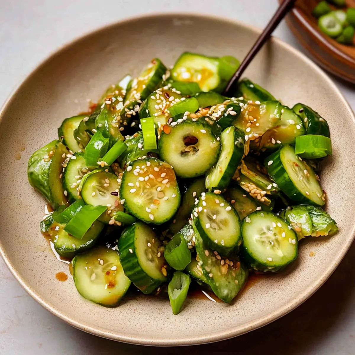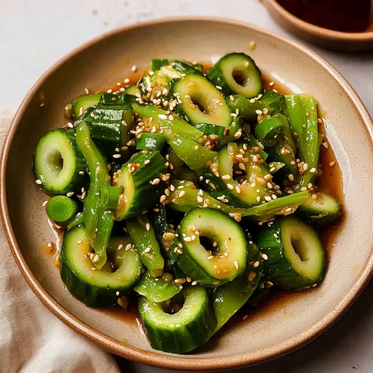 These Spicy Cucumber Salad ingredients are ideal for meal prep, allowing you to save time on busy days. You can prepare the cucumbers and dressing separately up to 24 hours in advance. Simply wash, slice, and store the cucumbers in an airtight container to maintain their crispness. Mix the dressing ingredients and store them in another container in the fridge until your meal is ready. When you’re ready to serve, combine the cucumbers and dressing, toss in the green onions and sesame seeds, and you’ll have a refreshing salad that tastes just as delicious as when freshly made. This prep-ahead approach means you can enjoy a vibrant dish without the last-minute rush.