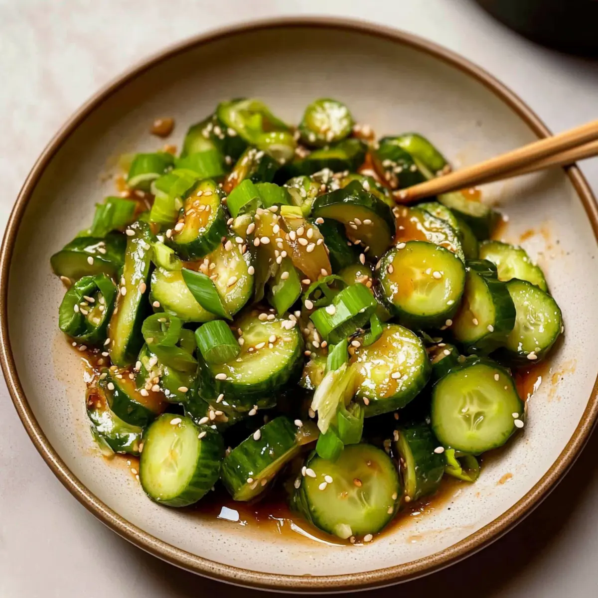 In a large bowl, pour the freshly made dressing over the prepared cucumber slices. Using a gentle tossing motion, mix the cucumbers until they are well-coated in the dressing, beautifully blending the flavors of your Spicy Cucumber Salad. Finally, top the salad with sliced green onion and a sprinkle of sesame seeds for an added pop of color and crunch before serving.