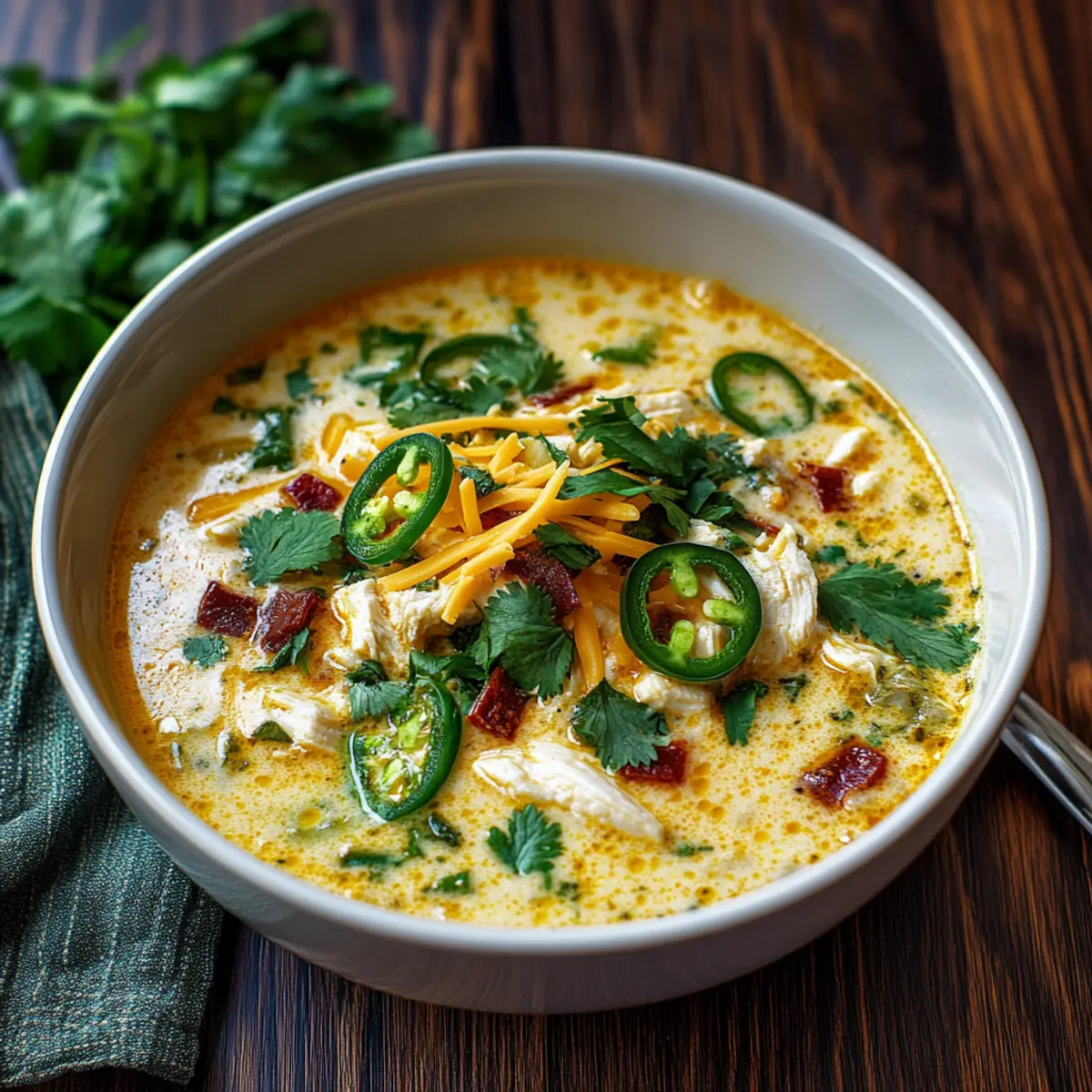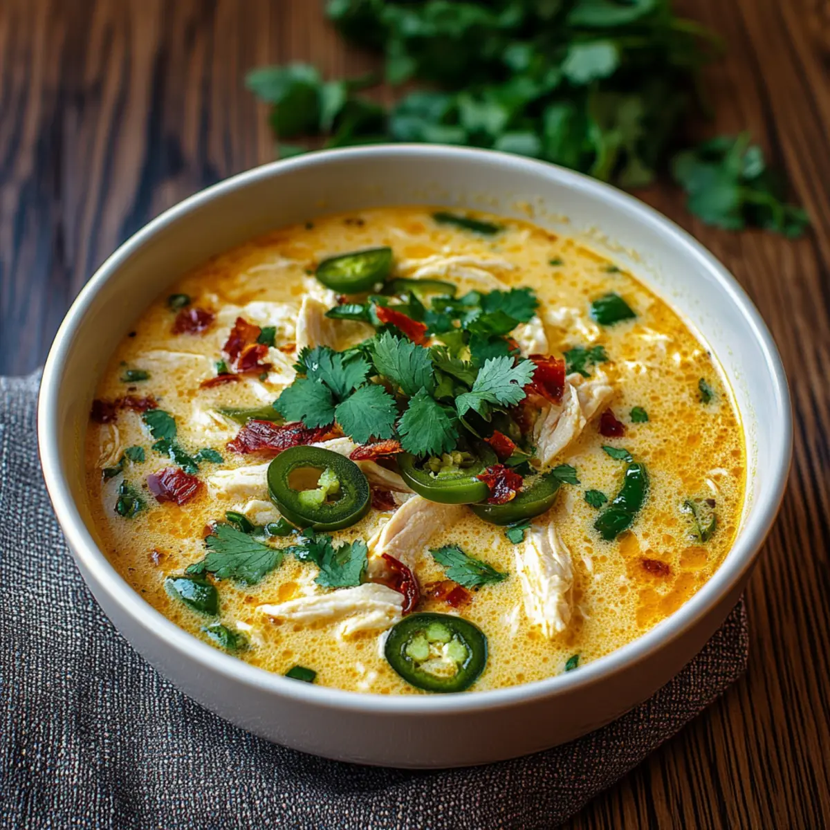 Ladle the hot soup into bowls, garnishing each serving with fresh cilantro for a burst of color and flavor. Serve your Spicy Jalapeño Popper Chicken Soup hot, pairing it with crusty bread or tortilla chips to enhance this cozy dining experience.
