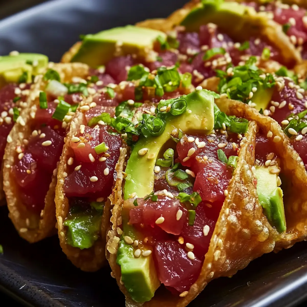 Once the wonton shells are ready, take them out and let cool slightly. Spoon a generous portion of the chilled tuna mixture into each wonton shell, allowing the vibrant colors of the Spicy Tuna Tartare Wonton Tacos to shine. Top each taco with slices of creamy avocado, and feel free to add jalapeños or pickled ginger for an extra flavor kick if desired.