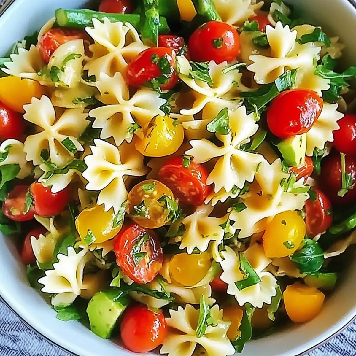 These vibrant Spring Pasta Salad ingredients are perfect for busy home cooks looking to save time during the week! You can prepare the farfalle pasta and roast the asparagus up to 24 hours in advance; simply cook the pasta al dente, drain, and refrigerate. Roast the asparagus and let it cool before storing it in an airtight container. You can also chop the cherry tomatoes and zucchini the night before and keep them in the fridge. However, it’s best to add the arugula and dressing just before serving to maintain freshness and prevent wilting. When you’re ready to enjoy your Spring Pasta Salad, simply combine all the ingredients, toss with the dressing, and relish a delicious meal with minimal effort!